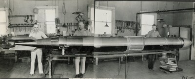 Two photographs juxtaposed together of the pump rocket used in flight test P15 which would take place February 9, 1940 (this photograph was taken February 6). This rocket was 18 feet 9 inches in length. This was the first attempted flight test in the P-Series. This was the first rocket flight ever attempted with fuel-fed pumps, and, feeling confident about the test's success, Robert Goddard invited his world-famous patron Charles Lindbergh, Harry and Alicia Guggenheim, photographers from National Geographic, and NAA (National Aeronautic Association) observers (hoping to get the flight on official record) to watch. Snow, ice, and rain prevented the test from being performed for ten days following the guests' arrivals. The rocket was in the tower during that time. When they finally performed the test, clogging due to ice caused the oxygen pump to blow apart and shred the rest of the rocket.