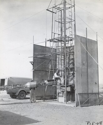 Photograph of the pump rocket used in flight test P15 being placed in the launching tower using a rope block and tackle on February 6, 1940. The test would take place on February 9th. Purported measurements of this rocket vary. In the annotation for this photograph, Esther lists it as 22 feet, but it was noted as 18 feet 9 inches in another photograph taken the same day. In a letter to Charles Lindbergh, Robert Goddard described it as 24 feet long.