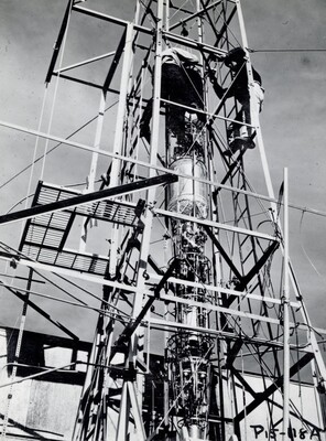 Photograph of the P15 rocket in the launching tower with the nose cone being worked on, February 6, 1940. The actual P15 test would take place February 9th. This was the first rocket flight ever attempted with fuel-fed pumps. Feeling confident about the test's success, Robert Goddard invited his world-famous patron Charles Lindbergh, Harry and Alicia Guggenheim, photographers from National Geographic, and NAA (National Aeronautic Association) observers (hoping to get the flight on official record) to watch. Snow, ice, and rain prevented the test from being performed for ten days following the guests' arrivals. The rocket was in the tower during that time. When they finally performed the test, clogging due to ice caused the oxygen pump to blow apart and shred the rest of the rocket.