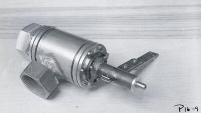 Photograph of an oxygen pre-cooling valve which is lighter than earlier models, March 21, 1940. This piece of equipment was part of the rocket used for the P16 test. Following the failure of P15, Robert Goddard invited the National Geographic photographer back for another test. The rocket's manifolds exploded. Following this flight test, Goddard resumed static tests.