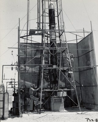 Photograph of a rocket in the launching tower and ready for test P22, which took place August 1, 1940.