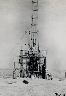 Photograph of static test P28 under way photograph is associated with the P28 test, which took place February 14, 1941. In Esther Goddard's annotation, she notes the narrow flame below the nozzle and the dust cloud at the rear.