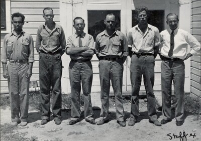 Photograph of Robert Goddard's staff for government work (left to right: Ornelas, Charles Mansur, Arthur Freund, Nils Lundquist, Lowell Randall, and George Bode), taken October 1941.