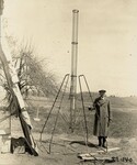 Photograph of Robert Goddard standing next to a "model tested May 4, 1926, with new launching frame" at Ward Farm in Auburn, Massachusetts (where tests took place until 1929). This new frame was built to accommodate the larger rocket model Goddard developed following failed attempts to make successful modifications to the much smaller model used for the landmark March 16, 1926 flight (as well as the April 3, 1926 flight). The May 4, 1926 test did not get off the ground.