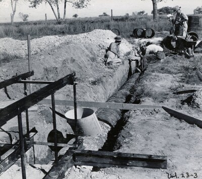 Photograph an underground muffler for testing stand, shown at left. Taken in November 1941. This was constructed as an attempt to lower the noise that full thrust tests would create, but it did not work. This meant tests at full thrust could not be conducted at Roswell.