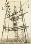 Photograph showing the test of April 20, 1927, with parachute attachment and turntable for launching. Goddard developed this much larger rocket model throughout the summer and fall of 1926 after being unable to make marked improvements on the much smaller model that took the historic March 16, 1926 flight. It was ready for testing by April 1927. The rocket was skeletal and held together by fuel piping. The combustion chamber and nozzle were at the bottom while the tanks and pumps were on top. This was the second attempted test with this model. Both tests were unsuccessful -- the igniter failed the first time and a lack of fuel pressure the second time.
