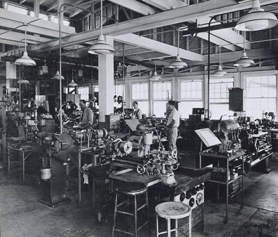 Photograph showing a view of Robert Goddard's shop interior at U.S. Naval Engineering Experiment Station in Annapolis, Maryland, taken in Fall 1942.