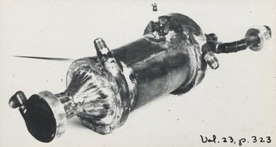 Goddard, Esther C., "[348] Combustion chamber adapted for intermittent firing, showing nozzle jacket, May 1945" (1945). The Goddard Rocket Researches: A Photographic Record [Individual Photographs]. 344.