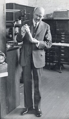 Photograph showing Robert Goddard with an early steel combustion chamber and nozzle in the Clark University shop area, circa 1920. This photograph is part of the final section of Esther Goddard's photo album titled "A Few Informal Photographs, Through the Years". Not all of these photographs were taken by Esther.