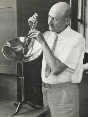 Photograph showing Robert Goddard at the Clark University laboratories with a sun-motor apparatus, circs 1934. This photograph is part of the final section of Esther Goddard's photo album titled "A Few Informal Photographs, Through the Years". Not all of these photographs were taken by Esther.
