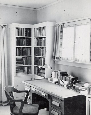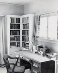 Photograph of Robert Goddard's office in his home at Mescalero Ranch, Roswell, New Mexico, circa 1941. This photograph is part of the final section of Esther Goddard's photo album titled "A Few Informal Photographs, Through the Years". Not all of these photographs were taken by Esther.
