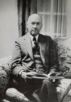 Robert Goddard in the living room of his Mescalero Ranch home in Roswell, New Mexico, circa 1937. This photograph is part of the final section of Esther Goddard's photo album titled "A Few Informal Photographs, Through the Years". Not all of these photographs were taken by Esther.