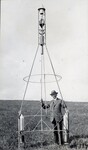 Photograph of Robert Goddard standing beside a rocket frame and rocket before a test on September 29, 1928. The combustion chamber and nozzle have been placed at the top again after a period of time experimenting with them at the bottom. During this test, the rocket began to rise but became caught in the tower.
