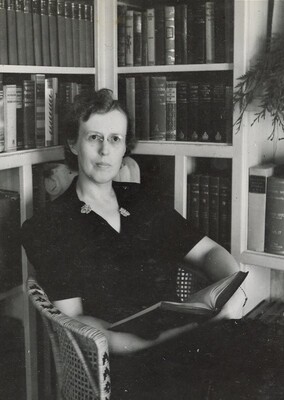 Photograph of Esther Goddard (Robert's wife) in the library at their home at Mescalero Ranch in Roswell, New Mexico, 1937. This photograph is part of the final section of Esther Goddard's photo album titled "A Few Informal Photographs, Through the Years". Not all of these photographs were taken by Esther.