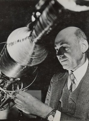 Photograph of Robert Goddard looking at a rocket motor he developed using pumps for propellants, circa 1940. This photograph is part of the final section of Esther Goddard's photo album titled "A Few Informal Photographs, Through the Years". This photograph can be found online with the year 1932 credited to it, but Esther dates it at 1940. The annotation in her photo album specifically links the rocket he poses with as one using pumps as propellants, which is relevant to 1940 but not 1932. Esther also has "N.G.S" handwritten next to her annotation, which likely stands for National Geographic Society. In 1940, Goddard invited photographers from National Geographic to Roswell to witness a rocket flight test that ended up being unsuccessful. The article never materialized.
