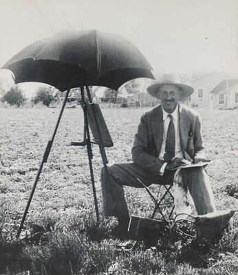 Photograph of Robert Goddard painting desert flowers on a Sunday in Roswell, New Mexico, circa 1936. Goddard's workshop can be seen in the background. This photograph is part of the final section of Esther Goddard's photo album titled "A Few Informal Photographs, Through the Years". In his spare time, especially Sundays, Goddard enjoyed painting with oils. His works mostly consisted of landscapes.