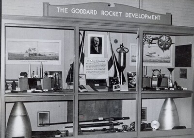 Photograph of an exhibit called The Goddard Rocket Development in the physics laboratories at Clark University. This photograph is part of the final section of Esther Goddard's photo album titled "A Few Informal Photographs, Through the Years". Not all of these photographs were taken by Esther.