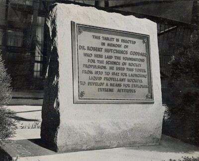 Photograph of the bronze plaque for the Robert Goddard memorial at the Roswell Museum in Roswell, New Mexico. The memorial is the launching tower Goddard used in the early 1940s. Inside it is a replica of a 1940 rocket. This memorial resides at the Roswell Museum in Roswell, New Mexico. The plaque reads "This tablet is erected in memory of Dr. Robert Hutchings Goddard who here laid the foundations for the science of rocket propulsion. He used this tower from 1930 to 1942 for launching liquid propellant rockets, to develop a means for exploring extreme altitudes."