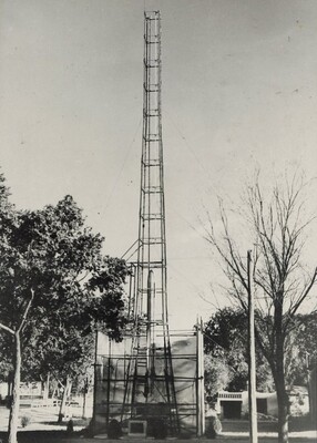 Photograph of the launching tower Robert Goddard used in the early 1940s, now a memorial. Inside it is a replica of a 1940 rocket. This memorial resides at the Roswell Museum in Roswell, New Mexico. This photograph is part of the final section of Esther Goddard's photo album titled "A Few Informal Photographs, Through the Years". Not all of these photographs were taken by Esther.
