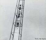Photograph of the July 17, 1929 test rocket nearing the top of the 60-foot tower. This still was taken from a piece of 16mm film shot by Esther Goddard. Esther would often extract still images from her own footage. Footage from this flight can be seen in can be seen in Reel 2 of The Goddard Rocket Film Reels.
