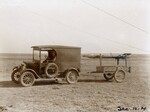 Photograph of a "rocket being transported to launching tower, 15 miles northwest of Roswell, 1930-1932" (annotation by Esther Goddard). In 1930, Goddard received his first Guggenheim grant (this one from Daniel) which would bring Robert and Esther to Roswell for two years of rocket research between 1930 and 1932. They would eventually relocate there for a much longer stretch of time, 1934-1942, under grants from the Daniel and Florence Guggenheim Foundation. In this photo album, as well as The Papers of Robert H. Goddard, Esther refers to this 1930-1932 period as "The First New Mexico Adventure".