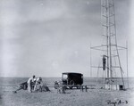 Photograph "repairing the launching tower near Roswell", September 1934 (annotation by Esther Goddard). Following a two-year gap in grant funding from the Guggenheim Foundation, Robert Goddard, his wife Esther, and his crew returned to Roswell, New Mexico in 1934. They revived sites like the workshop and the launching tower that were established during their first tour there, which took place between 1930 and 1932. In both The Papers of Robert H. Goddard and this photo album, Esther refers to this 1934-1942 period as "The Second New Mexico Adventure".