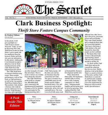 The September 5, 2025 edition of The Scarlet (est. 1939), Clark University's student-run newspaper. The Scarlet is intellectually and editorially independent of the University.