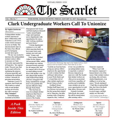 The January 24, 2025 edition of The Scarlet (est. 1939), Clark University's student-run newspaper. The Scarlet is intellectually and editorially independent of the University.