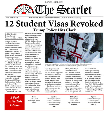 The April 25, 2025 edition of The Scarlet (est. 1939), Clark University's student-run newspaper. The Scarlet is intellectually and editorially independent of the University.