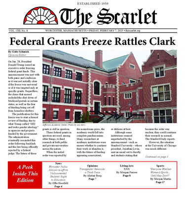 The February 7, 2025 edition of The Scarlet (est. 1939), Clark University's student-run newspaper. The Scarlet is intellectually and editorially independent of the University.